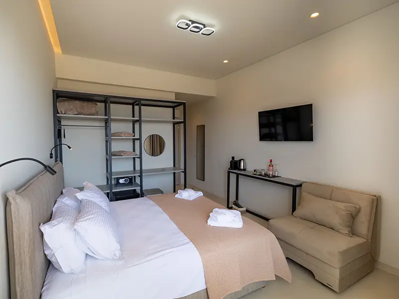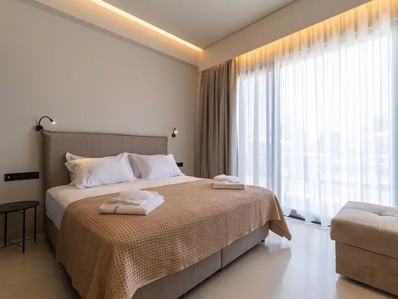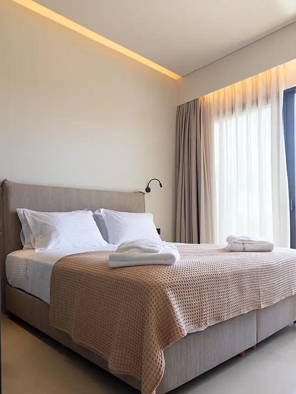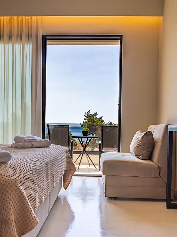 Our Sea View rooms in Tolo are decorated in a modern style, chosen to make the space warm & peaceful while complimenting their surroundings. Beije & cream tones help the eyes relax and hidden lighting brings everything together making our rooms the perfect place to unwind after an exciting day on the beach or after an exploration of the nearby archaeological sites. Each of our rooms has it's own private balcony that offers a gorgeous view of the Tolo coast, giving our guests a sense of freedom. Feeling the summer breeze and seeing the view from your balcony is an ideal way to enjoy your holidays in Tolo or to have a drink with your friend or other half.