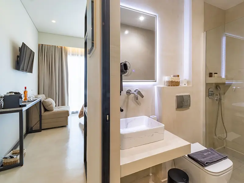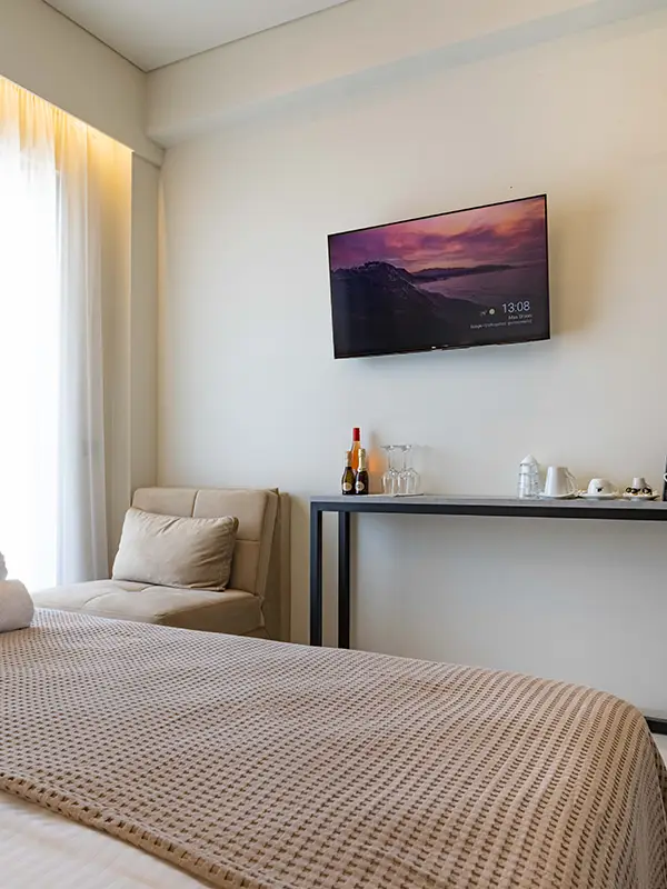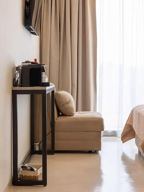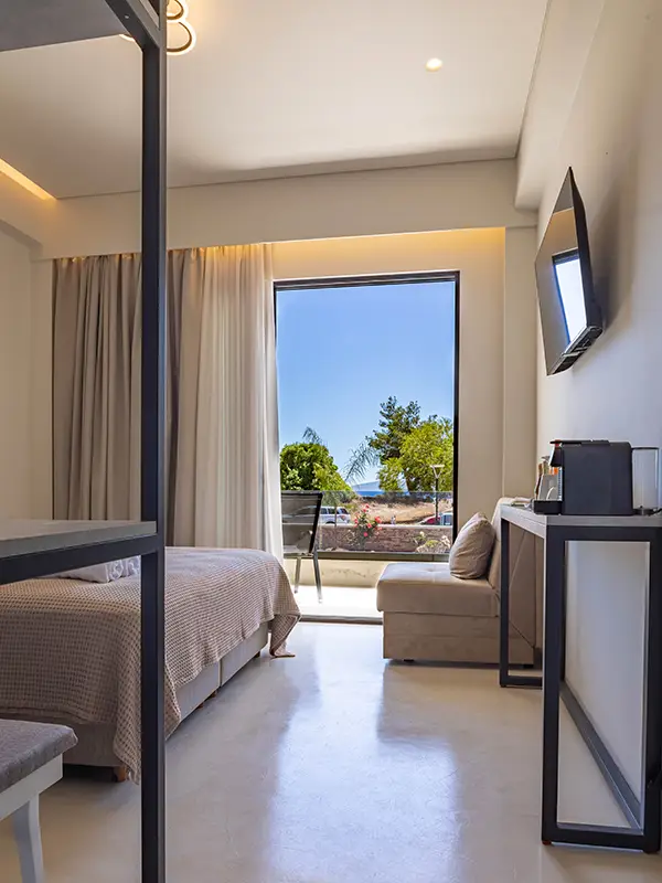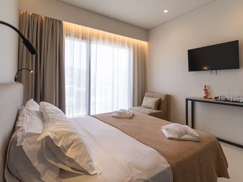 Our rooms in Tolo are designed to offer comfort and style in a beautiful setting right across Tolo beach. Each room is between 17-19m² and features modern amenities, such as a coffee maker (with capsules), light-up bathroom mirror, safety deposit box and thoughtful touches to ensure you have a relaxing stay in Tolo.